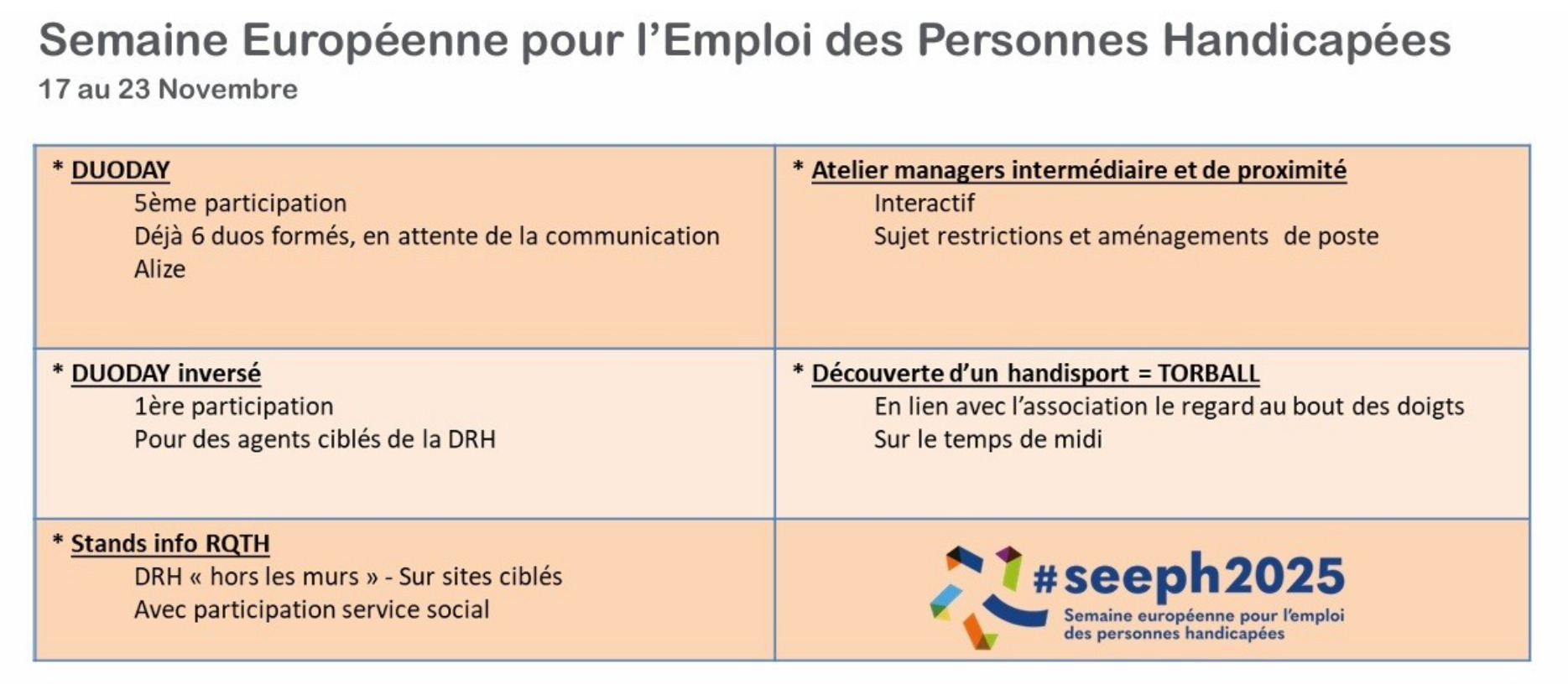 DuoDay est une initiative permettant tous les ans à une personne en situation de handicap de passer une journée en contexte professionnel afin d'observer le travail d'un collaborateur et de participer à ses tâches quotidiennes. Cette année, le DuoDay aura lieu le jeudi 20 novembre 2025.